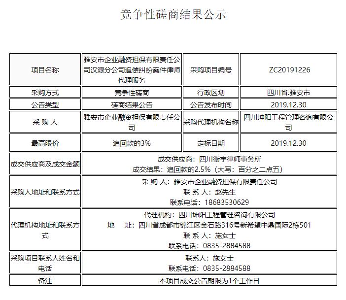 雅安市企業(yè)融資擔(dān)保有限責(zé)任公司漢源分公司追償糾紛案件律師代理服務(wù)競爭性磋商結(jié)果公示