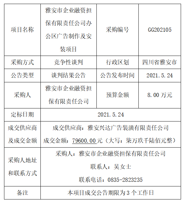 雅安市企業(yè)融資擔保有限責任公司辦公區(qū)廣告制作及安裝項目競爭性談判結果公告